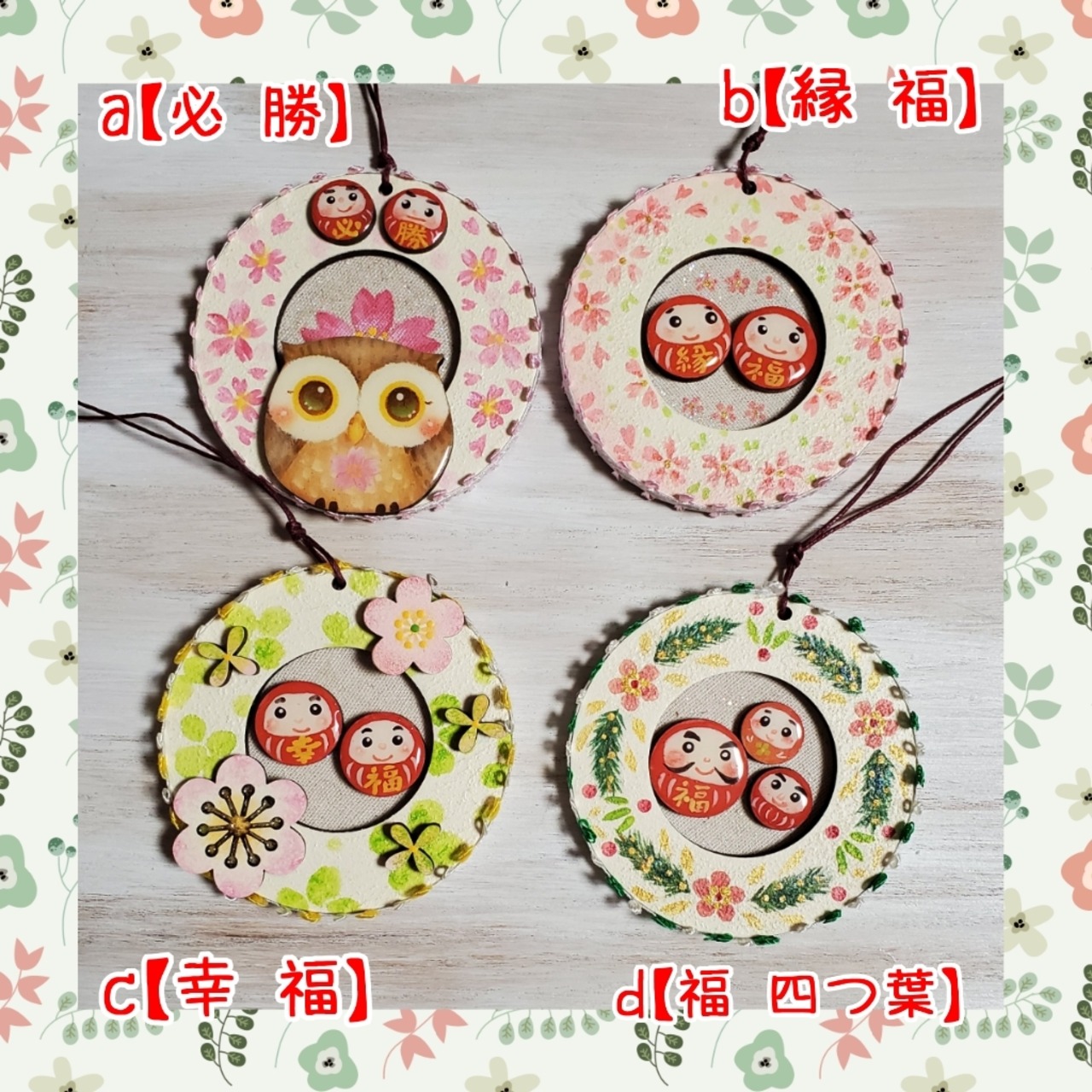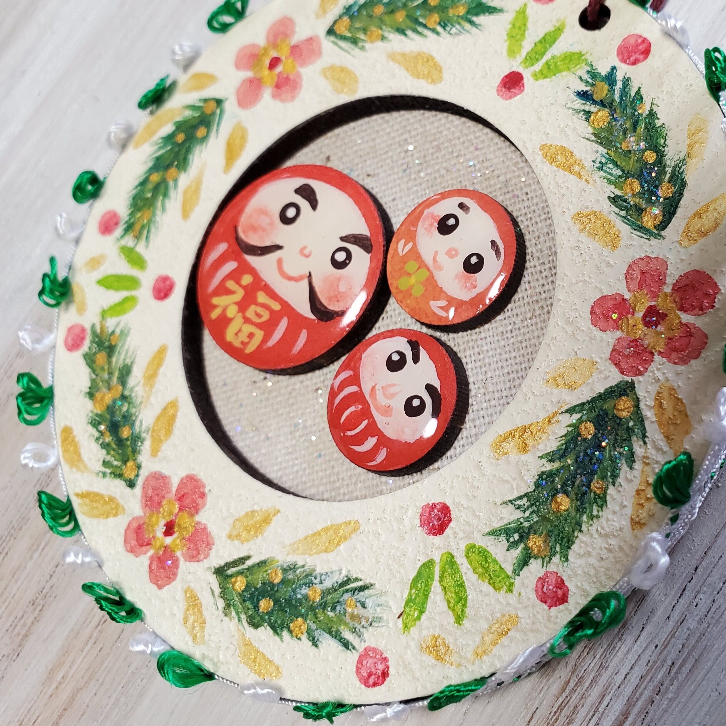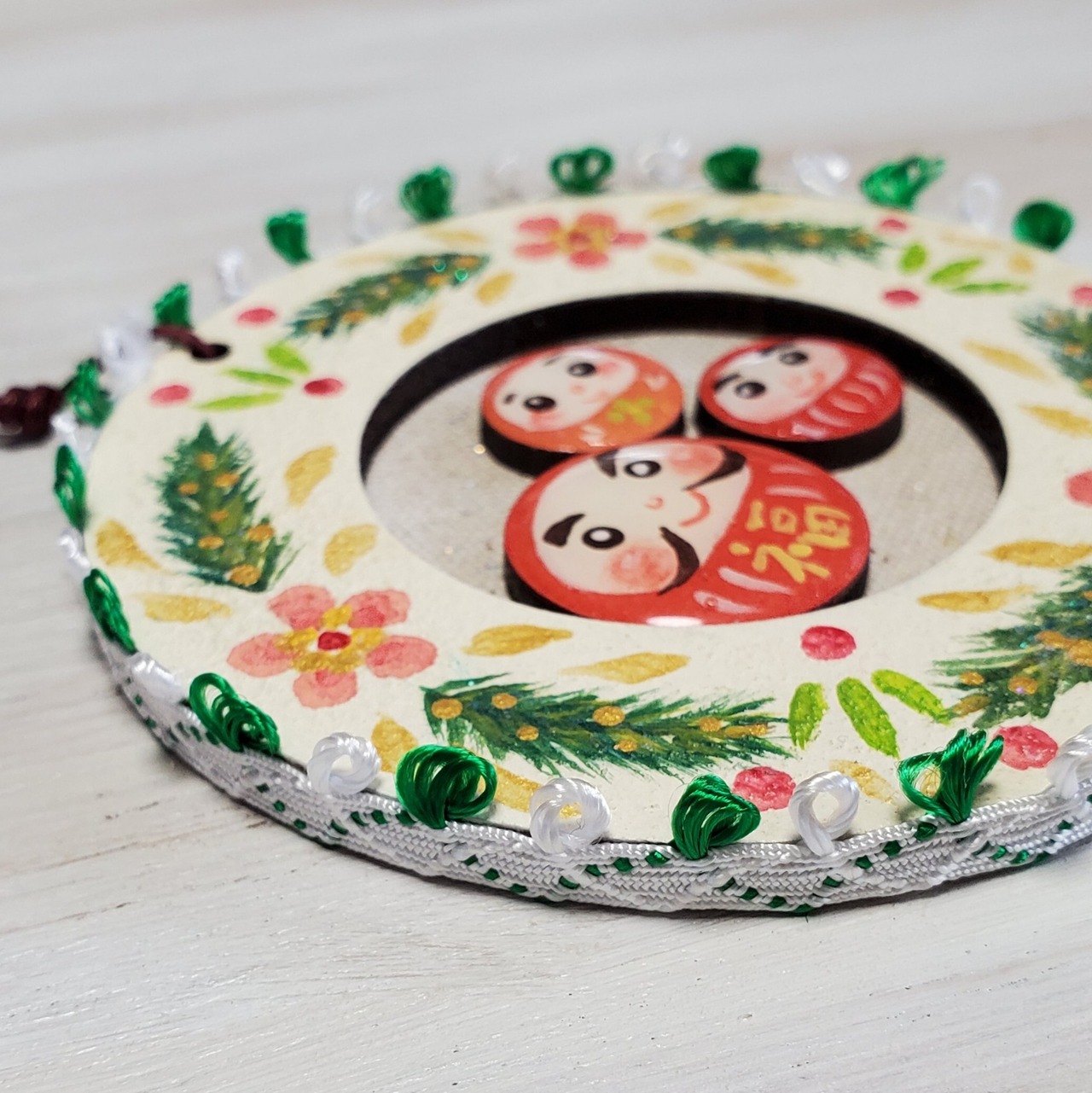 福と四つ葉のだるまを、松竹梅のリースと組み合わせた壁飾り(オーナメント)です。